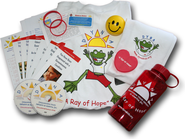 DYNA offers a variety of awareness products including brochures, water bottles, bracelets, t-shirts etc.