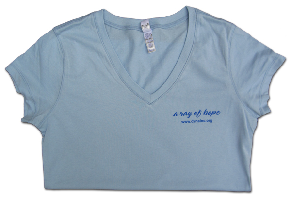 Ray of Hope Tee - A supersoft light blue v-neck women's tee. "A ray of hope" and www.dynainc.org are printed over the right chest.